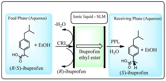 This methodology was further extended to the resolution of (S)-ibuprofen through selective CRL-catalyzed esterification of the (S)-enantiomer in the feedstock, diffusion of the ester through the SLM ionic liquid and regeneration of (S)-ibuprofen in the receiving phase by PPL (Scheme 10) []. This process provided (S)-ibuprofen in up to 75% enantioselectivity.