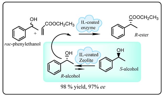 In a seminal study, Lozano et al. [,] developed a continuous dynamic kinetic resolution of rac-1-phenylethanol employing a mixture of Novozym® 435 lipase and a heterogeneous acidic zeolite in an ionic liquid-ScCO2 biphasic system. The role of the lipase was to catalyze transesterification of vinyl propionate with (R)-1-phenylethanol while the acidic zeolite was included to catalyze the isomerization of (S)-1-phenylethanol to the (R)-enantiomer. Both catalysts were first coated with ionic liquids by adsorption to stabilize the enzyme from the strongly acidic sites of the zeolite and the mobile ScCO2 phase. Overall, this catalytic system provided (R)-phenylethylpropionate in up to 98% yield and 97% enantioselectivity (Scheme 13) without any loss of catalyst activity after 14 days of operation. These findings clearly demonstrate the industrial potential of a combination of heterogeneous biological and chemical catalysis employing ionic liquids and ScCO2 in continuous flow process for green production of commercially important enantiomers.