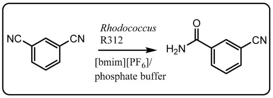 The first example of whole-cell biocatalysis employing a water-ionic liquid biphasic system was reported by Cull et al. using Rhodococcus R312 []. These cells contain nitrile hydratase which catalyzes the hydration of the nitrile group to an amide, a process of synthetic interest for producing fine chemicals and pharmaceutical intermediates. Toluene could be replaced by [bmim][PF6] as a reservoir for the substrate 1,3-dicyanobenzene and as an extraction solvent for the product 3-cyano-benzamide in this biphasic system (Scheme 15). It was observed that the initial rate of 3-cyanobenz-amide production was lower in the [bmim][PF6]-water biphasic system compared to the toluene-water system but that the overall yield was slightly higher. Since the specific activity of nitrile hydratase activity was found to be higher in the ionic liquid-water system and that the ionic liquid did not reduce cell viability, it was concluded the lower rate of product formation was due to reduced mass transfer of substrate from the more viscous ionic liquid phase. An advantage of [bmim][PF6] in downstream processing was reduced cell aggregation at the phase interface, which made product recovery and material recycling easier.