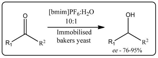 - Howarth, J.; James, P.; Dai, J. Immobilized baker’s yeast reduction of ketones in an ionic liquid, [bmim]PF6 and water mix. Tetrahedron Lett. 2001, 42, 7517–7519. [Google Scholar] [CrossRef]