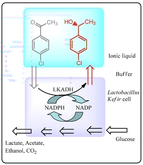 - Pfruender, H.; Midjojo, M.; Kragl, U.; Weuster-Botz, D. Efficient whole-cell biotransformation in a biphasic ionic liquid/water system. Angew. Chem. Int. Ed. 2004, 43, 4529–4531. [Google Scholar] [CrossRef] [PubMed]