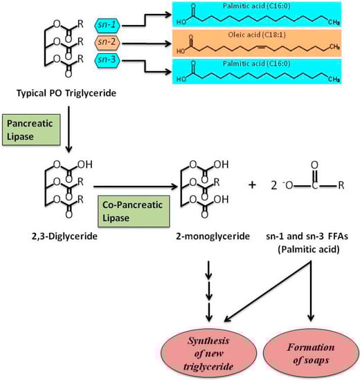 A schematic representation showing the hydrolysis of typical PO triglyceride. Palmitic acid, the main SFA in PO, is situated at SN-1 and SN-3 positions of TAGs. The other main FA in PO, oleic acid, is situated at SN-2 position. After digestion, FFAs are involved in the re-synthesis of new triglycerides and/or formation of Ca2+ or Mg2+ soaps. Free fatty acids, FFAs; palm oil, PO; saturated fatty acid, SFA; triglycerides, TAGs.