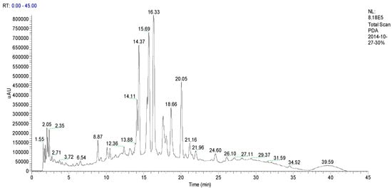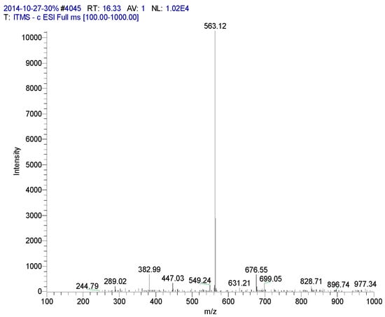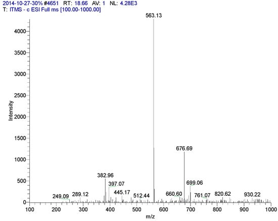 The chemical profile of a 30% ethanol extract of C. nutans (CN30) was shown in Figure 1 and identified by HPLC and LC-MS based on the HPLC fingerprints, molecular ions [M − H]−, and MS/MS fragment ions analysis. CN30 contained seven compounds that were identified based on the HPLC fingerprints, molecular ions [M − H]−, and MS/MS fragment ions analyses. The identified compounds were shaftoside, orientin, vitexin, isoorientin, isovitexin and 6,8-apigenin-C-α-l-pyranarabinoside (refer to Figure 1, Figure 2, Figure 3, Figure 4, Figure 5, Figure 6, Figure 7, Figure 8, Figure 9 and Figure 10). The identities of these molecules were additionally confirmed with the aid of 1H-NMR analysis, which was consistent with previously reported data [].