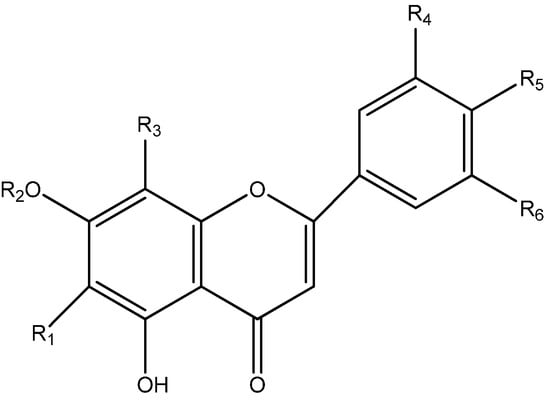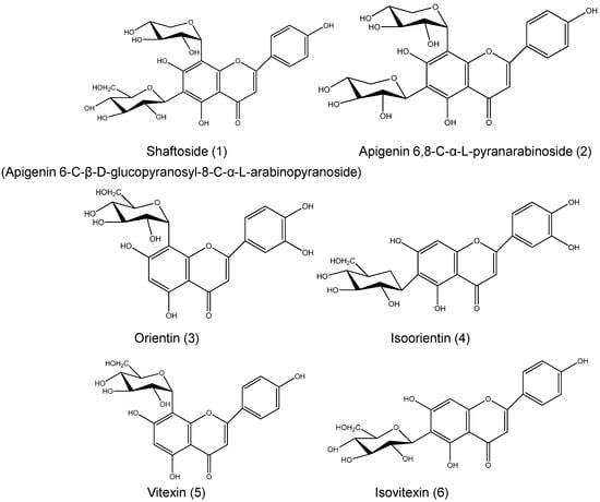 Chemical structures of known flavones in CN30 extract: (1) Shaftoside (Apigenin 6-C-β-d-glucopyranosyl-8-C-α-l-arabinopyranoside); (2) Apigenin 6,8-C-α-l-pyranarabinoside; (3) Orientin; (4) Isoorientin; (5) Vitexin; (6) Isovitexin.