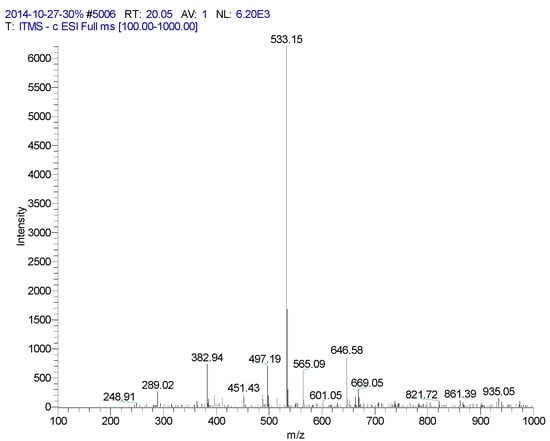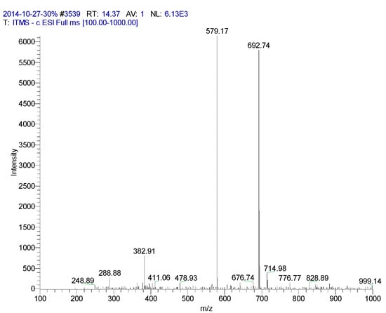 A fresh petal was homogenized and extracted with the mobile phase consisting of (A) 0.1% formic acid in water and (B) methanol. The crude extract was suspended in H2O and passed through a 0.5 μm Fluorpore Millipore membrane from Merck Inc. (Darul Ehsan, Malaysia) prior to injection (10 μL aliquot) into the Cosmosil™ C18-AR-II, LC Column (150 mm × 4.6 mm, 5 μm), Nacalai HPLC system(Kyoto, Japan). The flavonoids in the eluates were analyzed with an LC/MS/MS system; the eluates from a Shimadzu GC 20 instrument (Kyoto, Japan) equipped with a C18-AR-II, LC Column and a Finngan surveyor PDA plus Detector was introduced into an Esquire3000 ion trap mass spectrometer, LXQ from Thermo Scientific (Waltham, MA, USA). MS data were collected in auto-MS/MS mode. The samples were eluted at 35 °C with a flow rate of 1.0 mL/min. Detection wavelength was 280 nm. The solvent system used was a linear gradient of 1% to 90% solvent D (methanol) in solvent C (0.1% formic acid) over a period of 45 min.