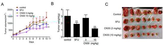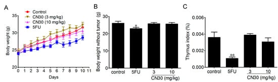All animal welfare and experimental procedures were carried out in strict accordance to the Guidelines for the Care and Use of Laboratory Animals (The Ministry of Science and Technology of China, 2006) and the related ethical regulations of the university. ICR mice (with normal T/B cells, 6–8 weeks, 18–22 g) were obtained from The Experimental Animal Center of Jiangsu University. HepAhepatocarcinoma tumor cells were obtained from Jiangsu Cancer Hospital and cultured in the aseptic form for tumor-bearing mice. Ascites were drawn from hepatocarcinoma mice (HepA) under aseptic conditions, and diluted in normal saline and subcutaneously implanted by injecting 0.2 mL of PBS containing 1 × 107 viable tumor cells under the skin on the right oxter of the mice. After 72 h of implantation, the tumor-bearing mice were randomly assigned to one of four experimental groups (10 mice per group), according to tumor size. Group one was injected with the tumor cells but treated with water only, group two was injected with tumor cells and received intraperitoneal injections of fluorouracil (20 mg/kg), and groups three and four were injected with tumor cells and treated with CN30 (3 mg/kg and 10 mg/kg, respectively) for 10 consecutive days through a gastric probe. The mice were weighed every day. On the 10th day, mice were weighed and euthanized, and tumors were removed and the weight measured. Tumor volumes were measured and calculated using the equation volume = a × b2/2, where “a” is the maximal width and “b” is maximal orthogonal width. The tumor wet weights of the treated (Tw) and control (Cw) groups were measured on the last day of each experiment, and the percentage of tumor growth inhibition was calculated as follows: Inhibition (%) = [1− (Tw/Cw)] ×100%.