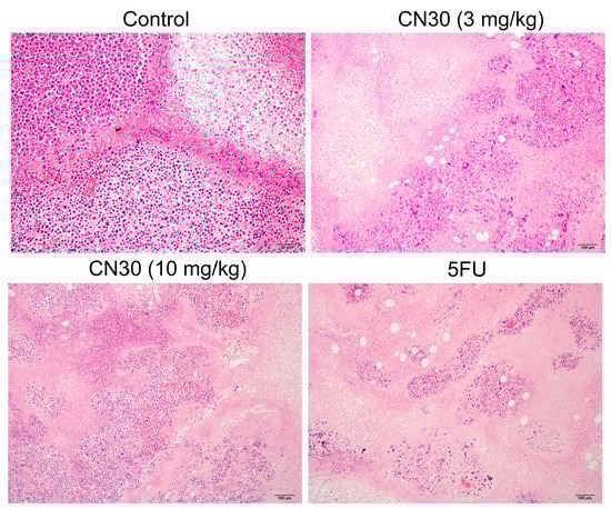 Recent studies have demonstrated that the immune system plays a critical role in the antitumor defense and immunomodulation could be a promising strategy in targeting tumor cells []. The spleen and thymus indices play an important role in the functioning of the immune systems of different organisms. T cells are involved in the process of tumor initiation, development, and metastasis inhibition. Mature T cells mainly differentiate into CD4+ and CD8+ cells [,]. CD4+ T cells induce the maturation of B cells into plasma cells and the activation of cytotoxic T cells, including CD8+ cells []. With the help of activated CD4+ T cells, CD8+ T cells migrate to the tumor site and exert a specific cytotoxic effect. Perforin and granzymes are released from CD8+ T cells []. Perforin forms pores in the cell membrane of the target cell, creating an aqueous channel through which the granzymes enter, leading to cell apoptosis via degradation of target cell DNA or stimulation of the FasL/Fas pathway [,]. Our results indicated that the thymus index of tumor-bearing mice treated with CN30 was significantly enhanced compared with those of fluorouracil-treated and untreated HepA tumor-bearing mice, which had decreased thymus indices. Likewise, CD8+ T cells were largely presented in the tumor tissues after CN30 treatment, which suggests that CN30 has protective effects on immune function by possibly promoting the functions of CD8+ T cells in suppressing HepA tumor growth.