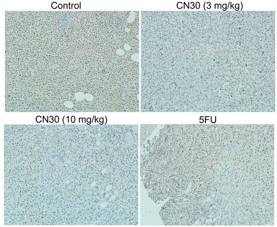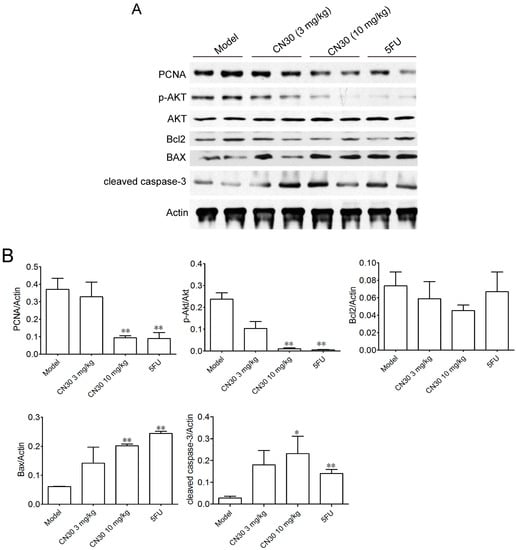 As shown in Figure 14, immunohistochemical staining and Western blot indicated that the expression of proliferating cell nuclear antigen (PCNA) was significantly decreased after CN30 treatment (Figure 14 and Figure 15). Treatment with CN30 caused cleavage ofcaspase-3, suggesting the initiation of the apoptosis pathway. Likewise, the expression level of the pro-apoptotic protein BAX was increased, with a corresponding decrease in the anti-apoptotic protein Bcl2 in treated tumor-bearing models suggestive of induced apoptosis by a shift in the BAX: Bcl2 ratio favoring apoptosis. Furthermore, the expression of p-AKT, cleaved-caspase-3, and BAX was significantly increased in treated models.