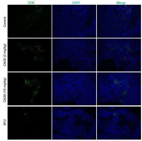 CD8+ T cells have been reported to play an important role in antitumor immunity. As shown in Figure 16, treatment with CN30 significantly enhanced the infiltration of CD8+ T cells to HepA tumor cells compared with the untreated control group, indicating that CN30 treatment could promote the function of CD8+ T cells.