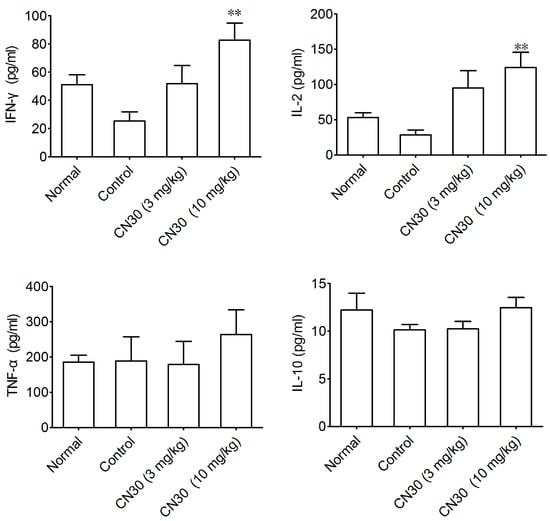 Effect of CN30 treatment on IFN-γ, IL-2, TNF-α, and IL-10 levels in the serum of tumor-bearing mice. The serum of the mice in each group was taken and cytokine levels were analyzed by enzyme-linked immunosorbent assay (ELISA). Data are presented as mean ± SD (n = 10). ** p < 0.01 vs. control group.