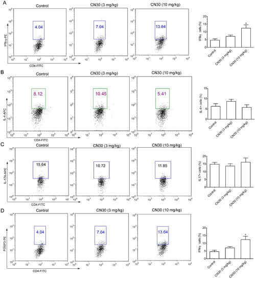 Intracellular staining of Th1 cells in the spleen of tumor-bearing mice. CN30 could significantly elevate the ratio of IFN-γ+ CD4+ T cells (Th1) in treated tumor-bearing mice (A) (control group 4.6%, CN30 10 mg/kg group 12.4%) while levels of IL-4+ CD4+ T cells (Th2) were decreased slightly (control group 6.3%, CN30 10 mg/kg group 5.7%) (B). Levels of IL-17A+ CD4+ T cells and FOXP3+ CD4+ T cells remained unchanged (C,D).