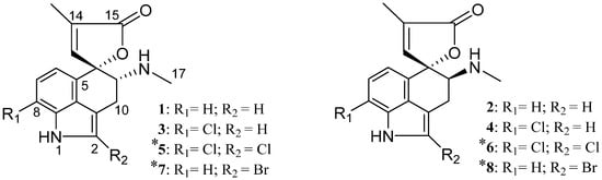 De Medeiros, L.S.; Da Silva, J.V.; Abreu, L.M.; Pfenning, L.H.; Silva, C.L.; Thomasi, S.S.; Venâncio, T.; Van Pée, K.-H.; Nielsen, K.F.; Rodrigues-Filho, E. Dichlorinated and Brominated Rugulovasines, Ergot Alkaloids Produced by Talaromyces wortmannii. Molecules 2015, 20, 17627-17644. https://doi.org/10.3390/molecules200917627