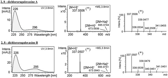 | (6) 2,8-dichlororugulovasine B | 337.0501 | 302.0812 | 301.0734 | 283.0628 | 255.0677 | 140.0703 |