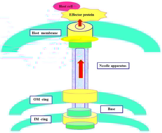 As one of the most complicated currently known protein secretion systems, the T3SS is usually encoded by a 30–40-kbp gene and exists in the bacterial chromosome or plasmid in the form of a pathogenicity island [8]. T3SSs of animal or plant pathogens possess many highly conserved main structural components, which are comprised of more than 20 proteins. Various pathogenic T3SSs are very similar in their structures, and their syringe-like appearance in transmission electron microscope images has led them to be called needle complexes (NCs) [9]. The core of the T3SS injection device is a needle-shaped complex that consists of a multi-ring base and a needle protrusion. The two parts are connected by an external needle, which protrudes from the bacterial surface [10,11,12] (Figure 1). The multi-ring base is composed of a pair of inner and outer rings that span the bacterial inner membrane (IM) and outer membrane (OM), and the two rings are connected by a rod-shaped structure passing through the IM and OM [13,14]. Needle protrusions have a straight hollow cylindrical structure containing the narrow center channel (~28 Å in diameter), specialized in transporting secretory proteins. The center channel stretches from the bottom of the ring structure to the top of the needle tip [15].