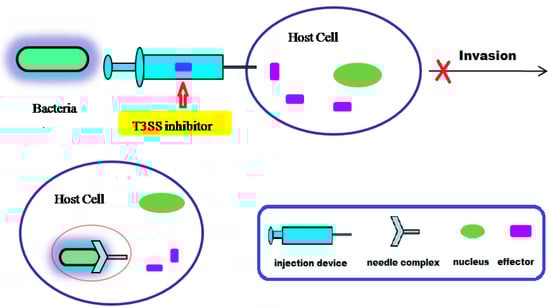 Highly conserved T3SS is a secretion system consisting of a variety of components, and the secretion follows a single-step, sec-independent model [18]. The secretory signal of T3SS secretory protein is not dependent on the signal peptide, but occurs through a 15–20-amino acid domain at the N-terminus of the secretory protein. The secreted proteins are not cleaved in the cytoplasm, but are transported to the cell surface from the cytoplasm [15]. The T3SS injection device forms a temporary structure when bacteria interact with the host cell. The injection device is activated for assembly under physiological conditions [15]; However, under low calcium conditions, the injection device can also be activated. The needle complex of T3SS secretes and translocates protein effectors into the host cytoplasm, interfering with the function of the host cell (Figure 1) [20,21,22,23]. Hundreds of effector proteins have been identified as potential T3SS substrates from diverse bacterial pathogens. Pathogenic T3SS effector proteins can alter signal transduction pathways in order to evade the host defense system. Some bacterial effectors can enter into host cells and destroy their immune system, ultimately inducing host cell death (Figure 2) [24]. Although the detailed molecular mechanisms of T3SS are still unclear, current research has shown that effector translocation by T3SS is a key way that Gram-negative bacteria can infect host cells [23,24]. T3SS has emerged as an attractive target for developing novel anti-virulence agents. In terms of therapeutic strategies, T3SS inhibitors might be used to prevent effector proteins from invading the host cell through active or passive immunization, so that the pathogens lose the ability to infect host cells (Figure 2).