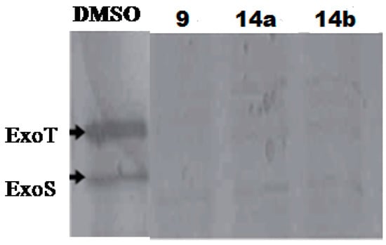 In order to search for more potent T3SS inhibitors against P. aeruginosa, our lab studied the structure-activity relationship (SAR) of MBX1641 in collaboration with Yang’s group at the University of Wisconsin at Milwaukee. We designed and synthesized a series of new α-phenoxyacetamide derivatives by modifying the 2,4-dichlorophenoxy group, the length of the amide side chain and the 3,4-(methylenedioxy)benzyl group [46]. P. aeruginosa PAO1 was chosen as the target strain, and a promoter-probe vector pPROBE-AT containing the promoterless green fluorescent protein (gfp) gene was used to construct an exoS promoter-gfp plasmid reporter pATexoS. PAO1 containing pATexoS was cultured in T3SS-inducing medium containing DMSO or supplemented with 250 μM of each synthesized compound, and promoter activity was assessed at 6 h by measuring GFP intensity using flow cytometry. Four new derivatives (14a–14d; Figure 6) have shown a strong inhibitory effect against exoS gene expression in P. aeruginosa. Among them, 14d not only exhibits stronger potency against PAO1 T3SS than MBX1641, but also has better solubility in aqueous solution. In addition, we selected a number of compounds to determine the expression level of ExoS and ExoT proteins via Western hybridization. MBX1641, 14a and 14b significantly inhibited the expression of ExoS and ExoT proteins (Figure 7). The results have demonstrated that the inhibitors can effectively suppress the expression of PAO1 T3SS effectors ExoS and ExoT.