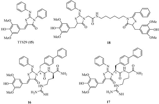 In search of S. typhimurium T3SS inhibitors, Felise et al. developed and performed a high-throughput screening for compound libraries of 92,000 small molecules and discovered that 2-imino-5-arylidene thiazolidinone (TTS29; Figure 8) inhibited T3SS secretion or assembly without affecting bacterial growth [47]. They purified the needle complexes of S. typhimurium and found that TTS29-treated samples had lower levels of needle components, whereas the levels of whole-cell proteins were unchanged. These results indicated that TTS29 disrupts the needle assembly. This inhibitor can block the secretion and virulence functions of a wide array of animal and plant Gram-negative bacterial pathogens, such as Y. spp., P. aeruginosa and Francisella novicida. However, the major disadvantage for TTS29 is its moderate potency (only 83 μM). Therefore, the researchers synthesized a series of new derivatives of TTS29, and the structure-activity relationship results showed that imino nitrogen, the aryl group and the substitution pattern on the arylidene ring are critical for inhibitory activity, whereas the amido nitrogen is tolerated for modification. Dipeptide analogs 16 and 17 (Figure 8) have much better potency than TTS29 at low micromolar IC50 values (8 μM and 3 μM, respectively) [48]. The new analogs were synthesized through a solid-phase approach. Some tethered thiazolidinone dimers had also been synthesized, and many of these dimers inhibited the T3SS-dependent secretion of a virulence protein at a concentrations lower than that of TTS29 [49]. For example, the IC50 value of dimer 18 is 5 μM.
