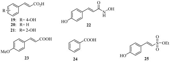 Natural plant phenolic compounds are secondary metabolites synthesized by plants. Apart from their role in growth, pigmentation and reproduction, they also play an important role in disease resistance. Plants have evolved a systemic acquired resistance mechanism to protect themselves from pathogen invasion [50]. Inspired by this self-protection mechanism found in nature, we explored inhibitors of D. dadantii T3SS hrpA genes. After systematically screening a series of natural plant phenolic compounds and their derivatives, we found that p-coumaric acid (19) (Figure 9) significantly repressed the expression of T3SS regulatory genes through the HrpS-Hrp two-component system [51]. On the other hand, trans-cinnamic acid (20) and o-coumaric acid (21) induced the expression of D. dadantii T3SS genes hrpA via the RsmB-RsmA pathway.