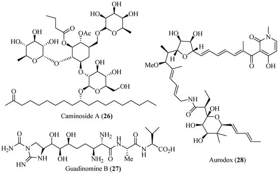 Structures of caminoside A, guadinomine B and aurodox.