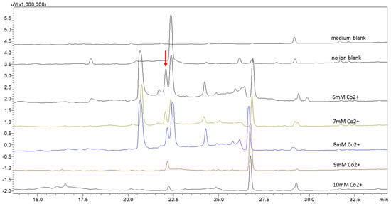 The metal-stress experiment was first carried out by setting four cobalt ion concentrations of 0, 5, 10, and 20 mM, respectively. The strain was cultured for 14 days at 24 °C under static conditions. It was observed that the growth of the strain was inhibited in 20 mM cobalt ion medium. The mycelium was removed and culture broth was extracted with ethyl acetate in equal volume. The HPLC profile of each extract showed the fungal metabolic response to ion stimulation when the cobalt ion concentration was up to 5 mM. When the cobalt ion concentration was 10 mM, few secondary metabolites were detected.