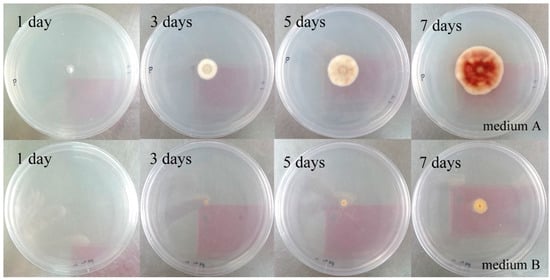 Fungal colonies in medium A (agar plates with PDA) and medium B (agar platess with PDA and 5 mM CoCl2) after 1, 3, 5 and 7 days of incubation.