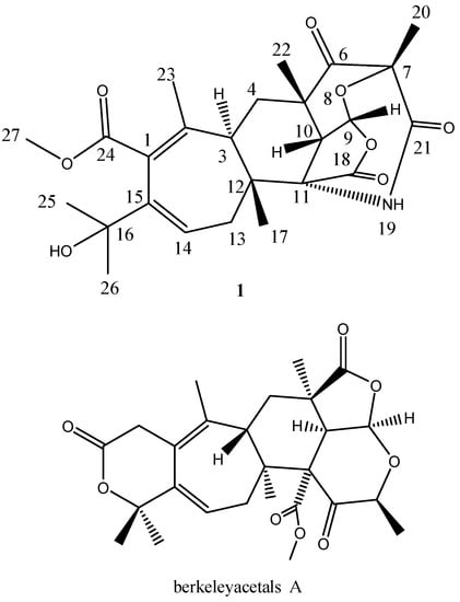 Compound 1 was isolated as a white powder. The molecular formula C25H31NO8 was determined by analysis of the HR-TOF-MS data. The formula was supported by the 13C-NMR data, which indicated 11 degrees of unsaturation. The NMR data (Table 1) of compound 1 were similar to those of the berkeleyacetals analogues [13]. These molecules contain two distinct domains, a tricyclic hydrocarbon and a δ-lactone ring, connected by a seven member ring [13]. The skeleton of fused polycyclic system contains a seven membered ring, a six membered ring, a five membered lactone ring and six membered ketonic ether ring. The 25 carbon signals comprised seven methyls (δC 16.5, 26.4, 26.8, 27.8, 30.7, 32.3 and 54.7), two methylenes (δC 32.4, 40.3) and three methines (δC 44.8, 45.2 and 100.0). A comparison between the DEPT 135 and 13C-NMR spectra revealed five quaternary carbons (δC 48.0, 51.7, 56.6, 81.8 and 85.6), two sets of double bonds (127.9 and 131.5, 139.8 and 140.9) and four carbonyls (δC 211.2, 173.2, 174.3 and 173.2). The 13C-NMR spectrum of 1 showed the presence of 14 signals for the hydrocarbon domain, including a tricyclic basic skeleton, with the remaining 11 resonances corresponding to a cyclohepta-1,3-diene with a dimethyl carbinol moiety and a methoxycarbonyl group. When compared to the NMR data of berkeleyacetal A [13], isolated from the fungus Penicillium sp. growing in Berkeley Pit Lake, compound 1 showed similar chemical shifts of the main fused polycyclic skeleton and the seven membered ring unit. However, 1D and 2D NMR analysis revealed that the substructure of tricyclic hydrocarbon and the units attached on it were less similar to berkeleyacetal A. In the 1H-1H COSY spectrum of compound 1 (Figure 6), the olefin proton at δH 6.39 (dd, J = 8.0, 5.2 Hz, H-14) was coupled with two methylene protons at δH 2.51 (dd, J = 13.2, 8.0 Hz, H-13α) and 1.78 (dd, J = 13.2, 5.2 Hz, H-13β), and the methine protons at δH 2.06 (dd, J = 13.5, 2.1 Hz, H-3) were coupled with two methylene protons at δH 1.50 (t, J = 13.5 Hz, H-4α) and 2.39 (dd, J = 13.6, 2.6 Hz, H-4β). The methine proton at δH 6.09 (d, J = 7.1 Hz, H-9) exhibited cross peaks with methine proton at δH 3.27 (d, J = 7.1 Hz, H-10) in the COSY spectrum of 1. The sequence and linkages of four ring system of H-3/H2-4/H-9/H-10/H2-13/H-14 was deduced from the above 1H-1H COSY analyses (Figure 6). HMBC correlation from Me-20 to carbonyl C-21 indicated that the carbonyl located at C-21 and the formation of the amide with the help of the molecular formula information (Figure 6). HMBC cross peaks of Me-20/C-6, Me-20/C-7 and Me-20/C-21 positioned a methyl at C-7. HMBC cross peaks of Me-22/C-4, Me-22/C-5, Me-22/C-6 and Me-22/C-10 assigned a methyl group at C-5 and positioned a ketone group at C-6. HMBC correlations of H-9/C-5, H-9/C-7, H-9/C-10, H-9/C-18, H-10/C-5, H-10/C-6, H-10/C-9, H-10/C-11, H-10/C-18 and H-10/C-22, together with the HMBC cross peaks of Me-22/C-10 and Me-22/C-6 revealed that a rearranged polyketide fused ring structure was formed. The long range correlations of Me-17/C-3, H-4/C-12 and Me-17/C-11 connected the fused three rings with the seven membered olefinic ring. In the 1H-NMR spectrum of 1, seven methyl groups displayed six singlet signals (H-20 and H-25 were overlapped as one peak), one of which was assigned at olefinic quaternary C-2 from the observation of HMBC cross peaks of Me-23/C-1, Me-23/C-2 and Me-23/C-3. The long range correlation from the proton signal at δH 3.67 (s, Me-27) to the ester carbonyl signals at δC 137.2 (C-24) positioned the OMe attached at carbonyl 24. The HMBC correlations of H-14/C-16, H-25/C-15, H-13/C-15 and H-25/C-26 revealed that the lactone ring at the carbon backbone of berkeleyacetal A [13] was opened and rearranged, and a dimethyl carbinol group was attached at C-15. The quaternary carbon signal at δC 51.7 was attributed to C-11 from the analysis of long range correlations from the proton signals at δH 1.04 (s, H-17) to quaternary C-11. The proton signals at δH 3.28 (s, H-10) and 1.77 (s, H-13) also showed diagnostic HMBC correlations with δC 51.7. Considering the linkage with C-10, C-12 and C-18 and the chemical shift of quaternary carbon C-11, the amide bridge was formed between C-7 and C-11.