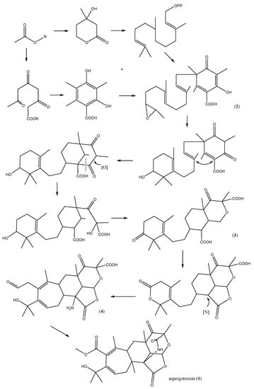 Berkeleyacetals, paraherquonin [14] and citreonigrin [15] are reported polyketide–terpenoids which have similar skeletons to aspergstressin. However, studies on their biosynthesis are scarce. Based on the biosynthetic studies on andibenin A-B [16] and terretonin [17], two other polyketide–terpenoid compounds isolated as Aspergillus fungal metabolites, a biosynthetic pathway can be proposed for the new stress-induced metabolite 1 (Scheme 1). Alkylation of 3,5-dimethylorsellinate by the terpenoid precursor farnesyl pyrophosphate gives the important intermediate 2. Polyketone ring opening and etherification with a hydroxyl forms an epoxy structure by enol tautomerism and oxidation (compound 3). Amidation at position 7 forms an amide bridge, followed by hydrolysis and rearrangement of the cyclohexene lactone ring to afford aspergstressin (1).