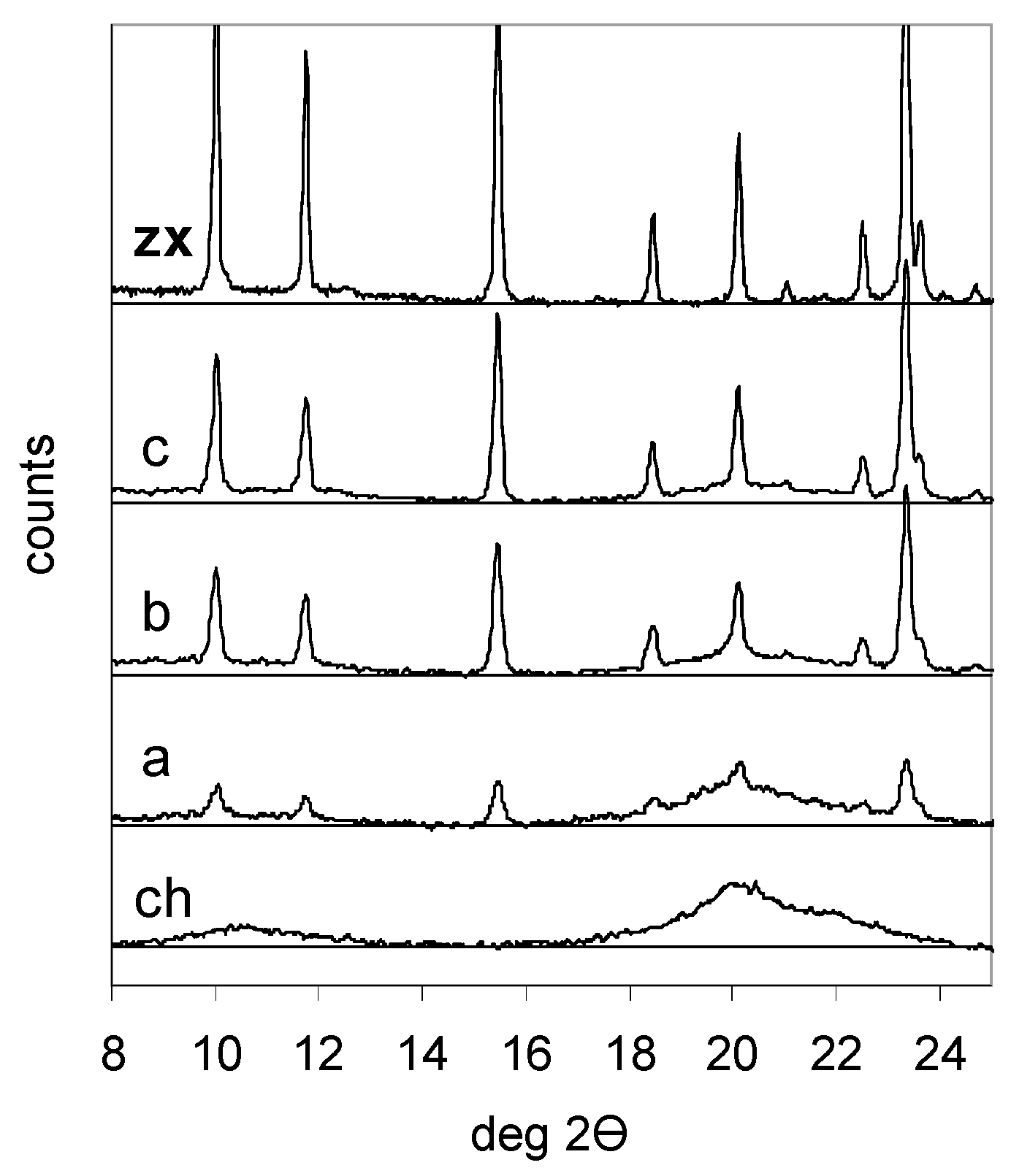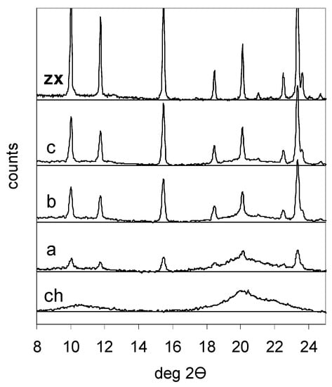 XRD patterns of chitosan (ch); chitosan-zeolite composites A (a); B (b) and C (c); and zeolite Na-X (zx).