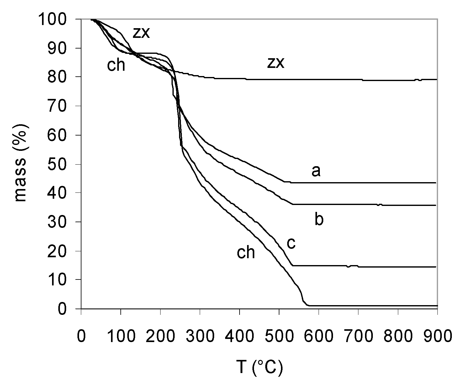 TG plots of aerogels of chitosan (ch), composites A (a); B (b); C (c) and zeolite X (zx).