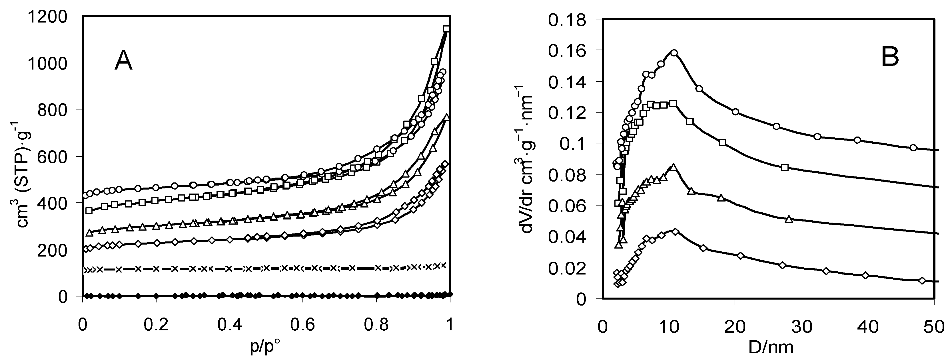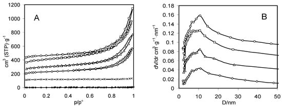 N2 adsorption-desorption isotherms (A) and pore size distributions (B) of zeolite X (crosses) and aerogels (void symbols) and xerogels (filled symbols) of chitosan (circles) and composites A (squares), B (triangles), and C (lozenges). Aerogel curves are shifted by 100 cm2 (STP)·g−1 in (A) and by 0.02 cm3·g−1·nm−1 in (B).