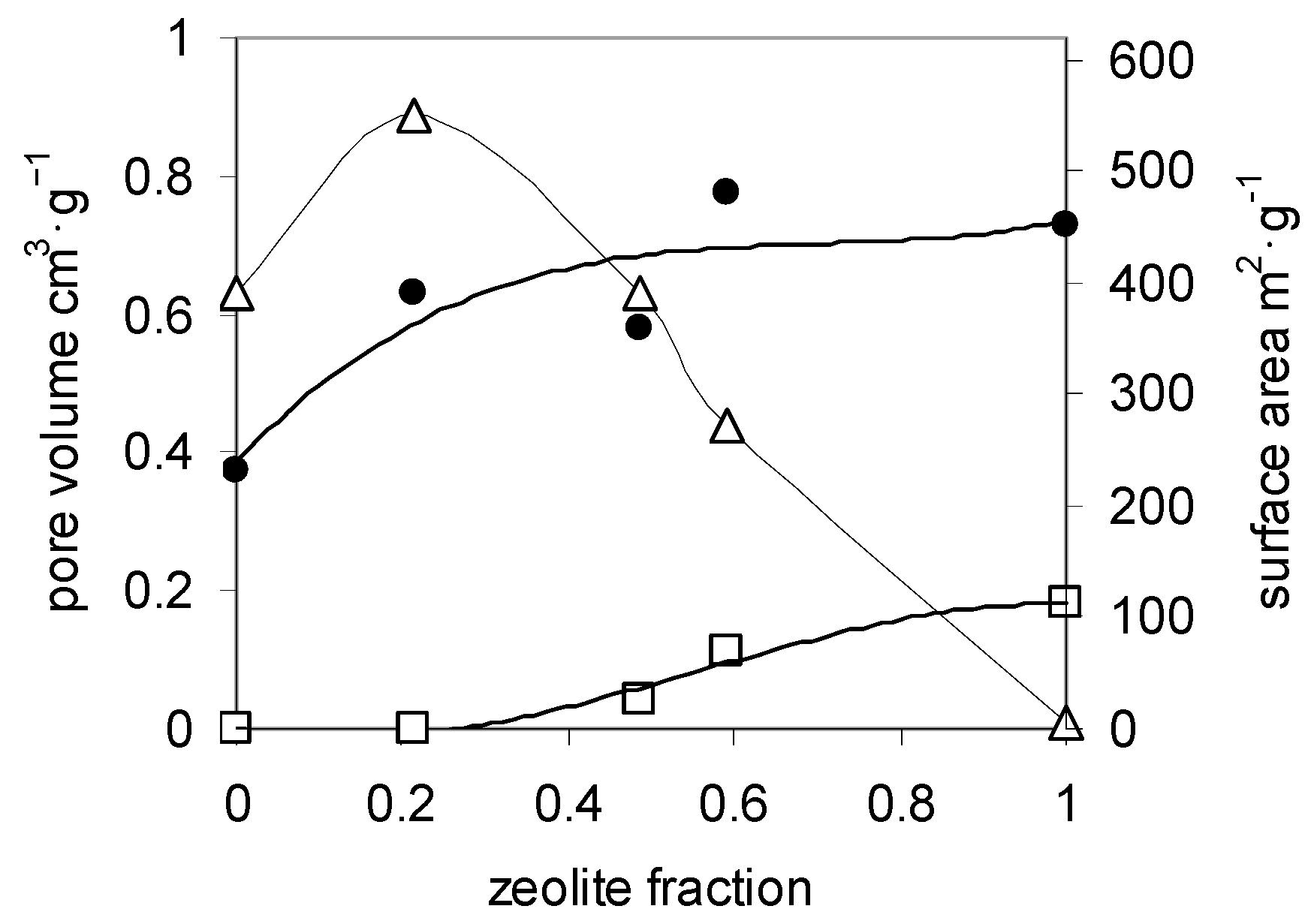 Texture of chitosan and composite aerogels vs. zeolite content. Mesopore (void triangles) and micropore (void squares) volumes (left side Y axis) and surface area (filled circles, right side Y axis). The lines are guides for the eye.