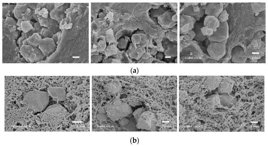Scanning electron micrographs of xerogels (a) and aerogels (b) of composites A, B, and C from left to right. Scale bars 1 μm.