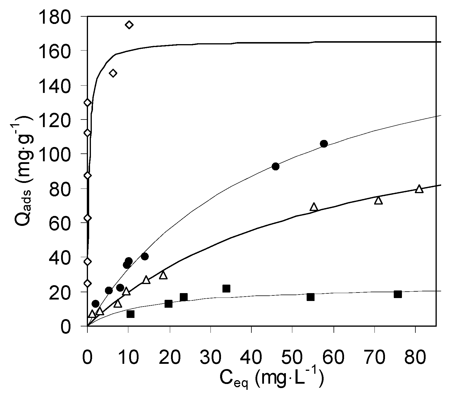 Cu(II) sorption on zeolite X (void lozenges), chitosan hydrogel (filled circles), aerogel (void trangles) and xerogel (filled squares). The lines are best-fit Langmuir curves.