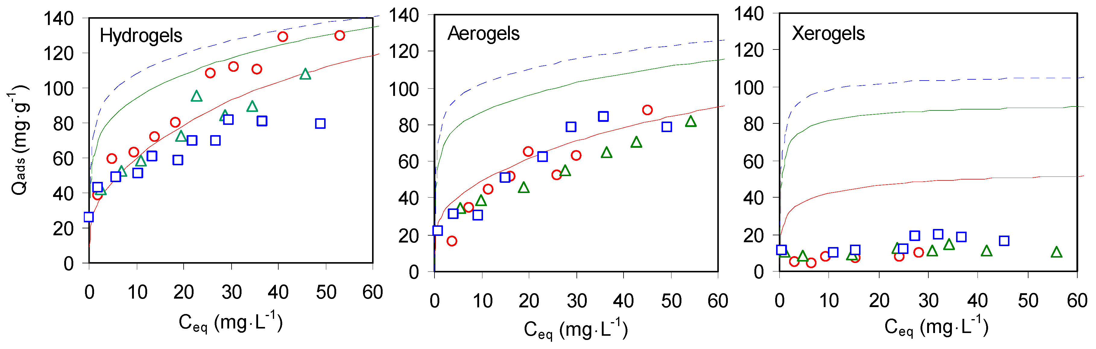 Figure 7 allows visually comparing the sorption isotherms of aerogels and hydrogels. The sorbed amounts on aerogels are patently lower that the amount sorbed on the corresponding hydrogels, especially at the lowest equilibrium concentrations. The Langmuir Qmax of Table 3 could seem in disagreement with this visual observation, as they are quite similar for corresponding aerogels and hydrogels. This apparent contradiction is solved when the Langmuir affinity constants of the same table are taken into account, as they are systematically lower for the aerogels than for the hydrogels. This indicates that a potential high sorption capacity is only reached at not realistical high concentrations. Globally, the sorption trends correspond to the need for a higher concentration in solution to make accessible the sorption sites in the aerogels than in the hydrogels of the composites.