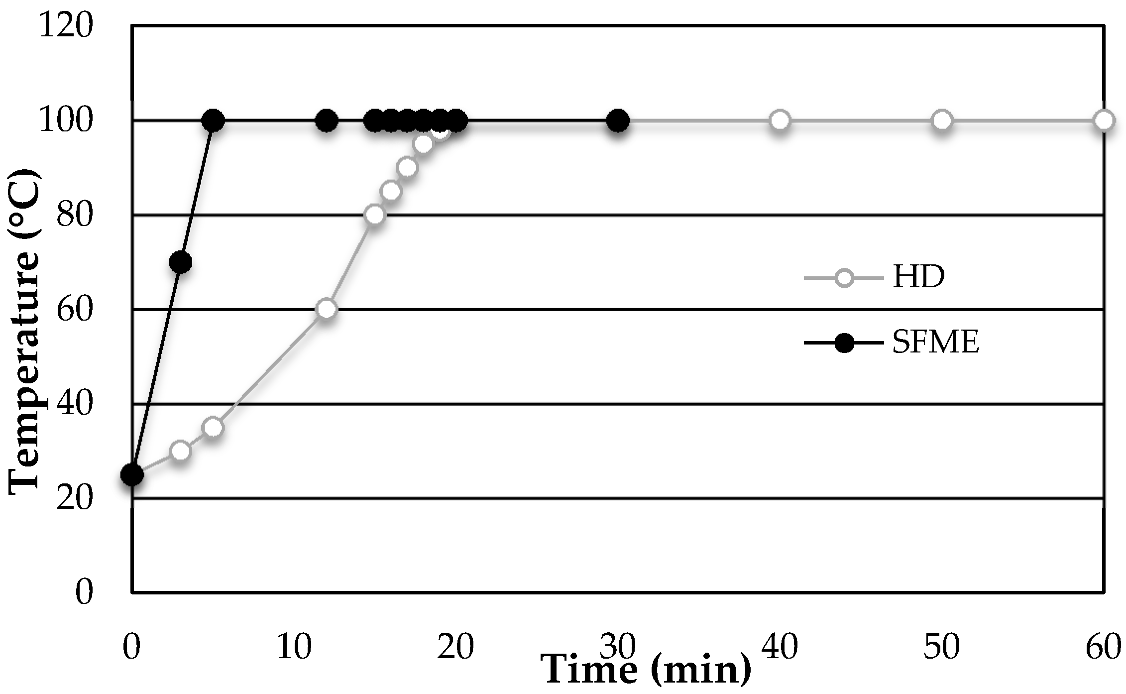 Figure 1 and Figure 2 represent the kinetics of EO obtained by SFME and HD from dry basil leaves. During the extraction process, the system temperature is equal to the boiling temperature of water at atmospheric pressure (100 °C). To reach this temperature, and thus obtain the distillation of the first EO droplet, it is necessary to heat the sample for only 5 min with SFME against 20 min for HD (Figure 1).