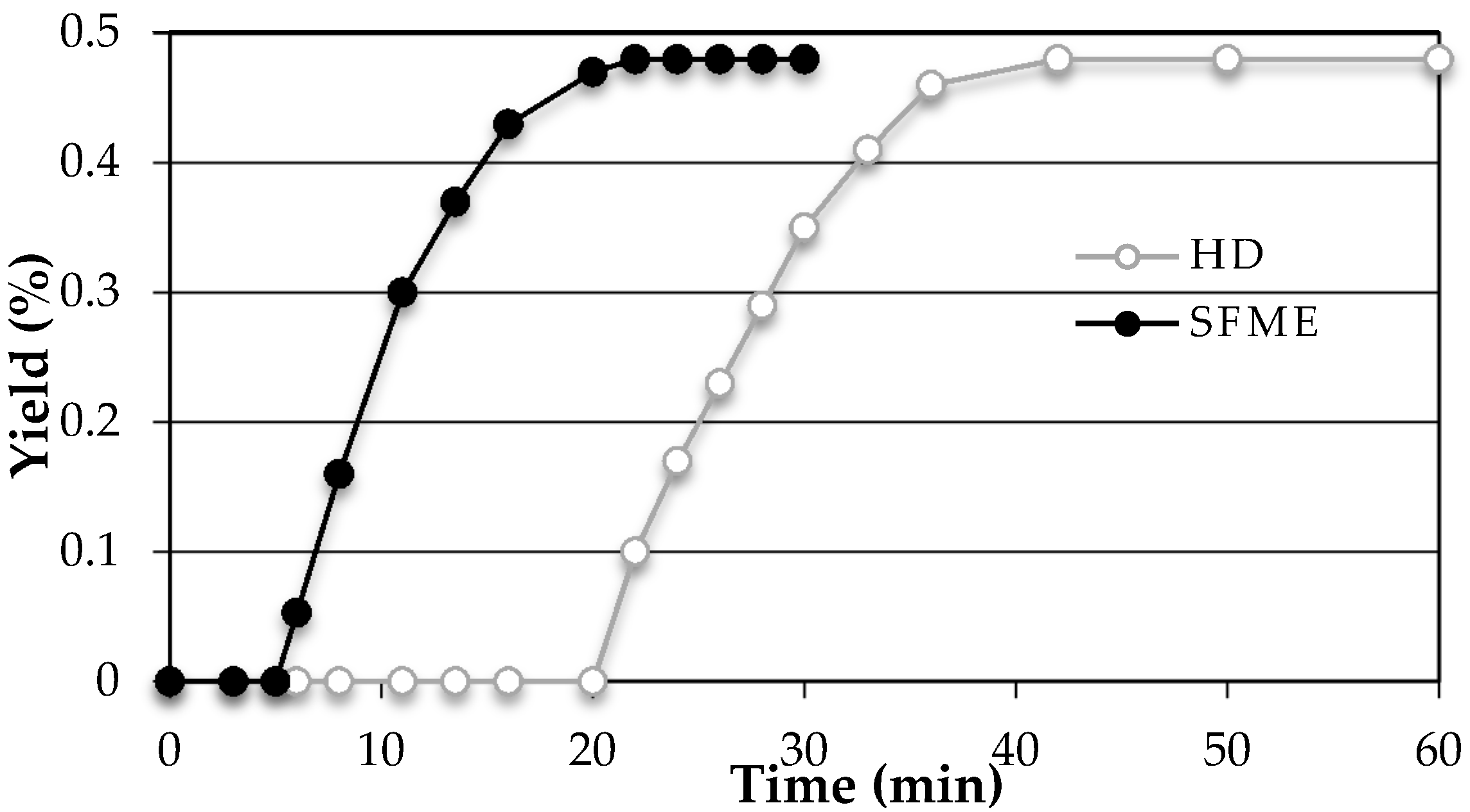 As shown on Figure 2, an extraction time of 30 min with SFME provides similar yields (0.48% ± 0.02%) to those obtained after 60 min by HD. The results show that SFME is clearly advantageous with respect to conventional HD in terms of rapidity, efficiency, and substantial energy savings.