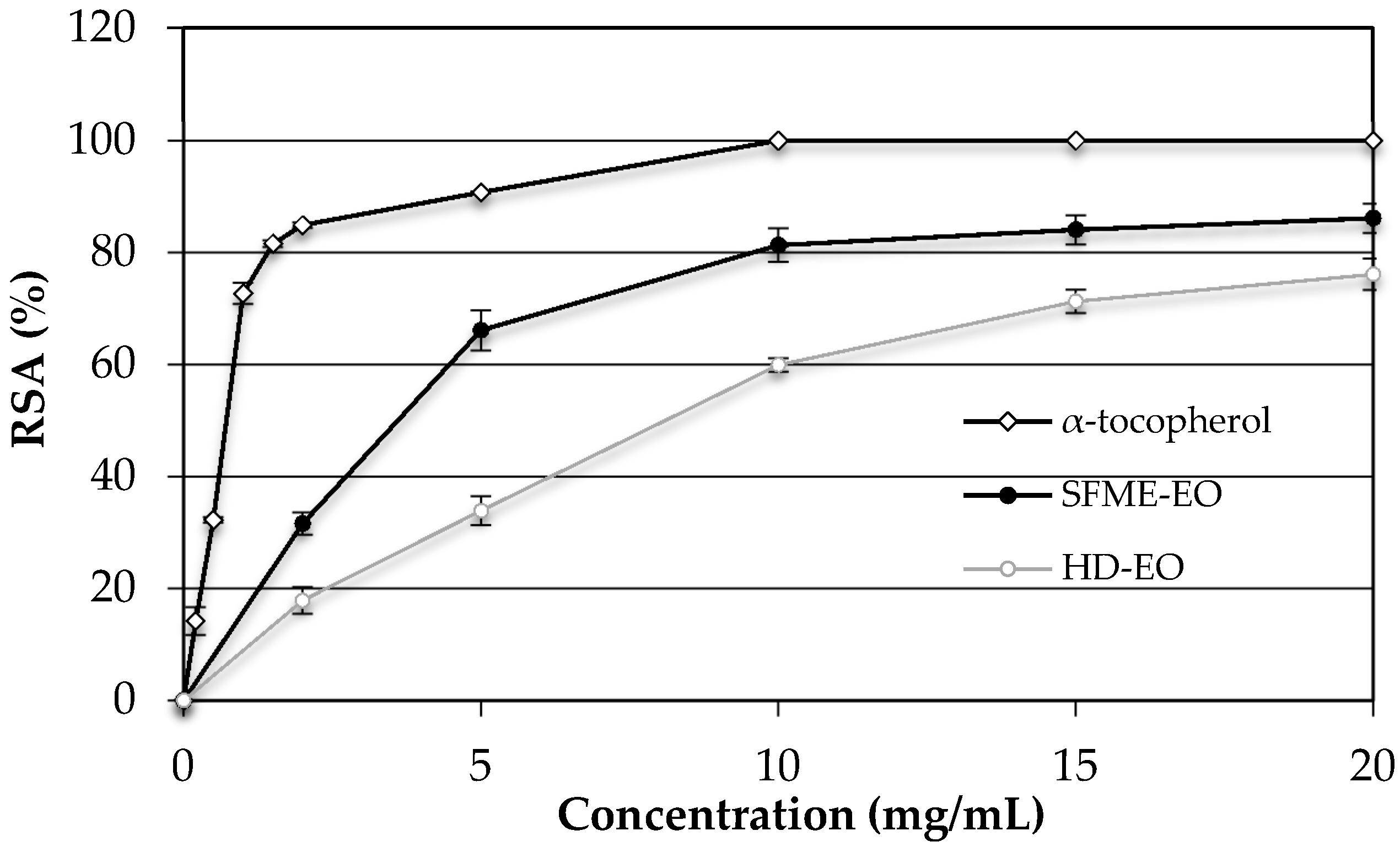 The IC50 value, which represents the EO concentration that caused neutralization of 50% DPPH radicals, was determined from the plot of the inhibition percentage against concentration. The capacity of each antioxidant was compared with the α-tocopherol (vitamin E) standard using the same methodology for various concentrations (0.2–5 mg/mL).