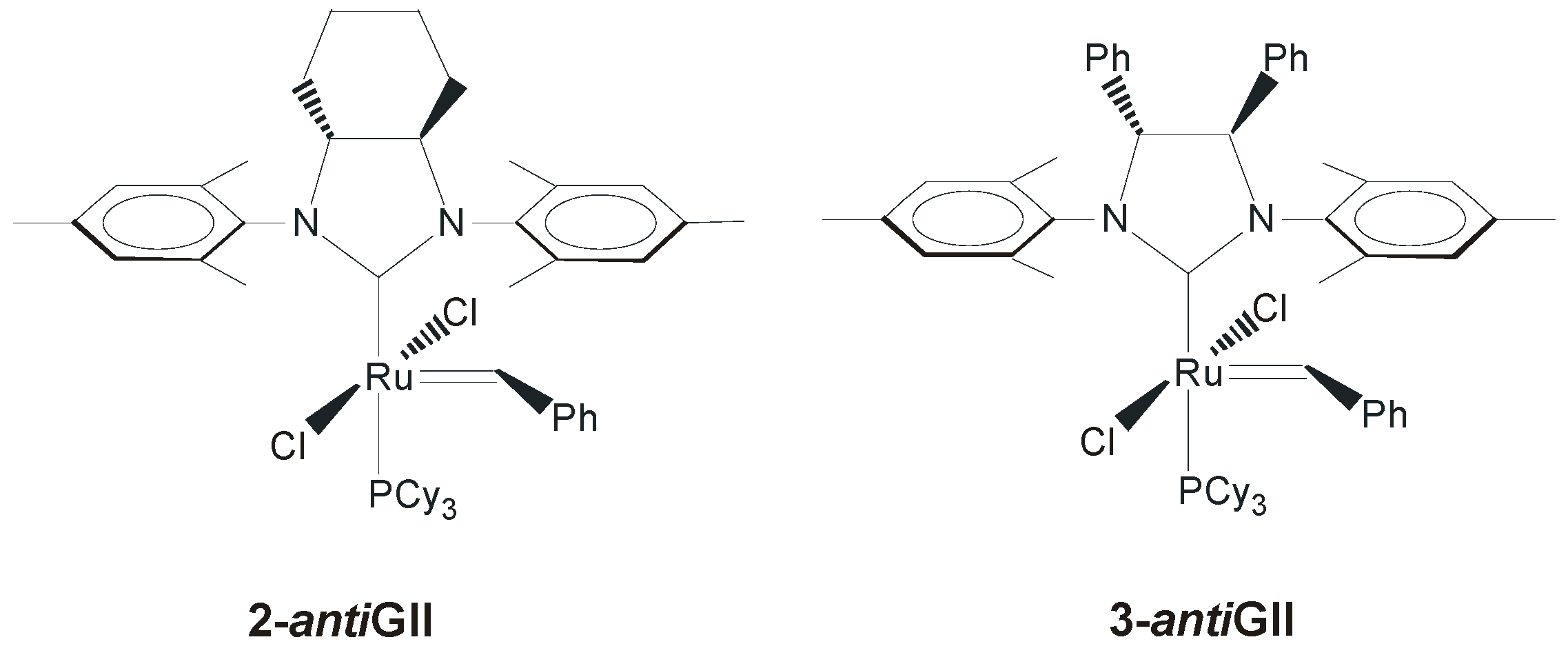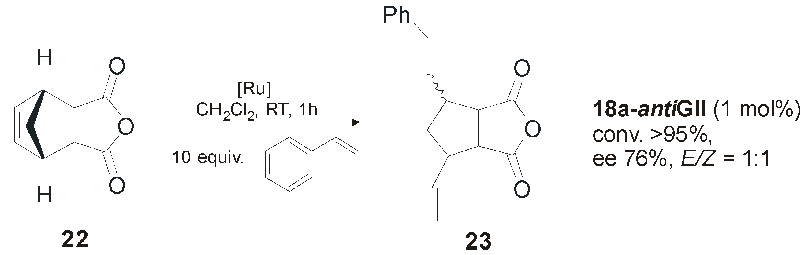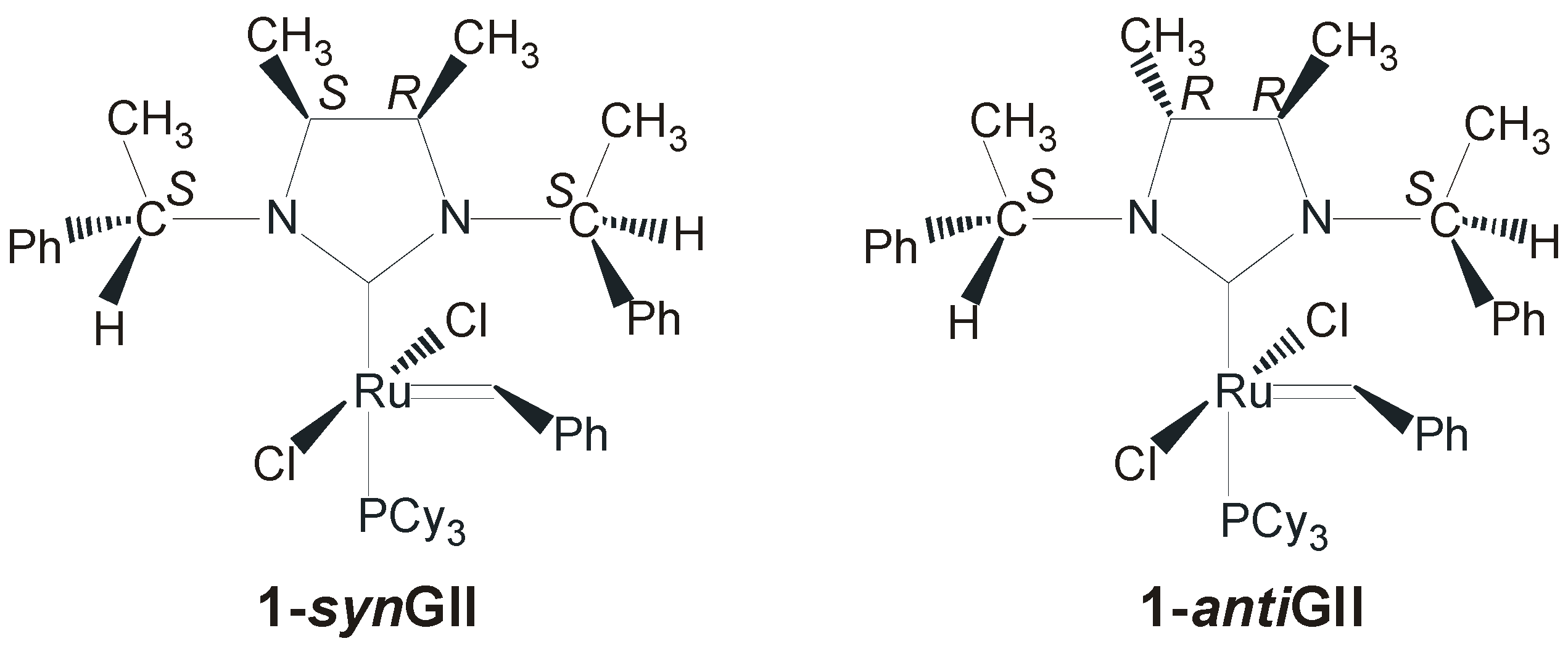 Both complexes, presenting S-phenylethyl N-substituents and syn (1-synGII) or R,R-anti (1-antiGII) methyl groups on the backbone, were prepared in around 40% yield by deprotonation of the corresponding imidazolinium salts obtained after condensation of the corresponding chiral diamines. 1-synGII showed higher cataytic activity than 1-antiGII in all reported representative reactions (Scheme 1) [34], however both performed worse than GII.