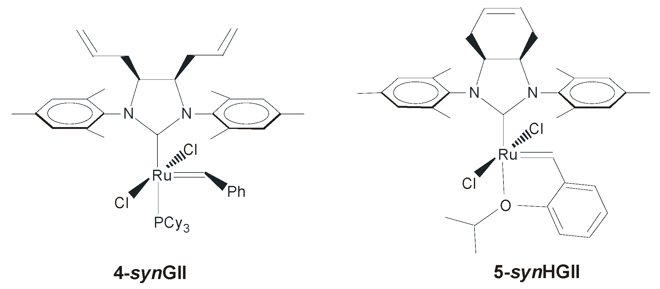 The first example of a ruthenium complex bearing an NHC ligand with a syn configuration of the backbone was reported by Köhler et al., in 2005 (Figure 4) [36]. With the aim of synthesizing complex 4-synGII with syn allyl substituents on the backbone as functional groups for immobilization of the catalyst to a solid support, they instead formed a new NHC ligand featuring an olefinic group in the ligand backbone, then employed it to prepare the complex 5-synHGII. In the ring-closing metathesis of N,N-diallyl-4-methylbenzenesulfonamide, complex 5-synHGII was slightly less active than the benchmark catalysts HGIItol, especially at low catalyst loadings.