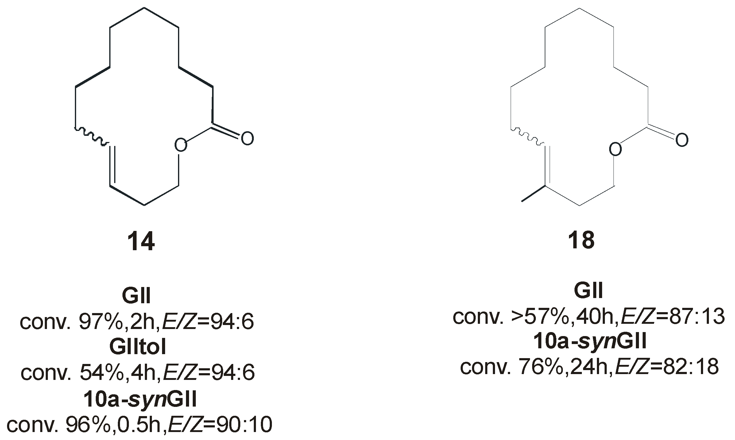 In the macrocyclic RCM reactions (Scheme 3) to form the 14-membered lactones 14 and 18, respectively (Figure 9), complex 10a-synGII showed better performance than benchmark catalysts GII and GIItol, proving that correct N-tolyl conformation, combined with increased stability due to NHC backbone substitution, led to highly efficient catalysts.