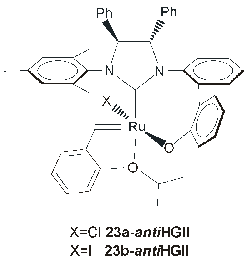 The relevance of the chirality of the NHC backbone in ruthenium complexes with differing N-aryl substituents was also proved by the work of Hoveyda and co-workers. In 2005, they reported the synthesis of the biphenolate NHC complexes 23a-antiHGII and 23b-antiHGII (Figure 16), presenting a C1-symmetric bidentate NHC ligand [56].