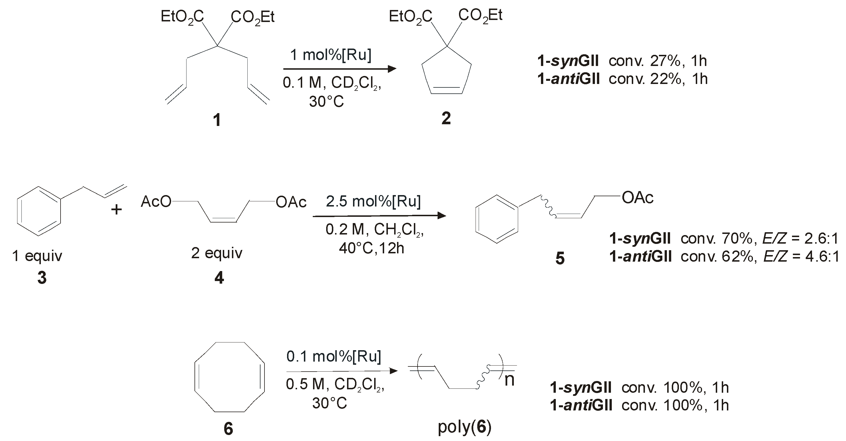 Indeed, in the presence of 1-synGII the ring-closing metathesis (RCM) of diethyl diallylmalonate (1) led to only 27% of conversion to product 2 after 1 h, and the cross–metathesis (CM) of allylbenzene (3) and cis-1,4-diacetoxy-2-butene (4) to 70% yield of 5 in 12 h, giving in all reactions slightly higher conversion than its anti analogue. Better results, although mediocre compared to GII, were observed in the ring-opening metathesis polymerization (ROMP) of 6, where 100% conversion was achieved in 1 h. Most likely the presence of benzyl N-substituents slows down the efficiency of catalysts with respect to N-aryl groups. Nevertheless, it is possible to discriminate in the described complexes a different behavior of catalysts with syn or anti NHC backbone configuration, being 1-synGII always better performing than 1-antiGII. Interestingly, in ROMP and CM reactions both the catalysts gave improved selectivity toward Z double-bond formation (E/Z ratio of 2.6:1 with 1-synGII).