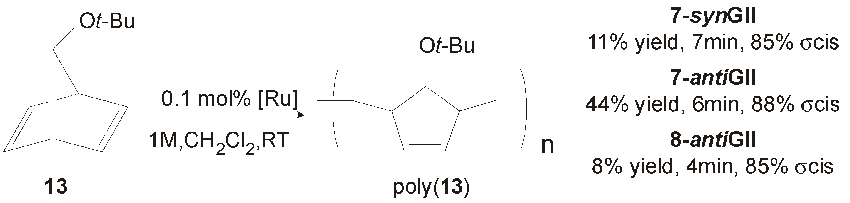 7-synGII and 7-antiGII were tested in the ROMP of 13 (Scheme 2), as well. Both catalysts gave highly sindiotactic poly(13) with low polydispersities (PDI = 1.1–1.2), 100% of anti units and cis contents that reached 88% in the case of 7-antiGII. The latter surprisingly was found more active than the syn analogue, converting 44% of monomer in 6 minutes with 0.1% of catalyst [40].