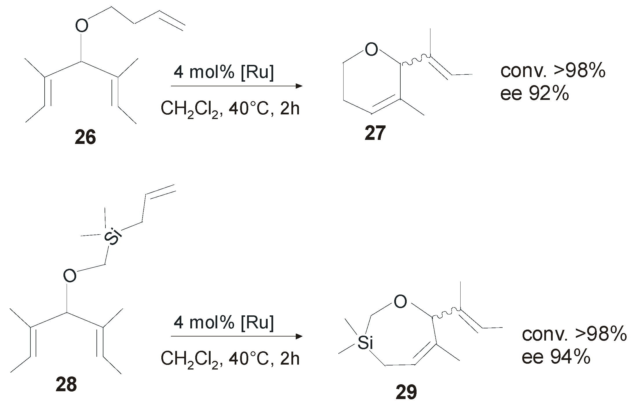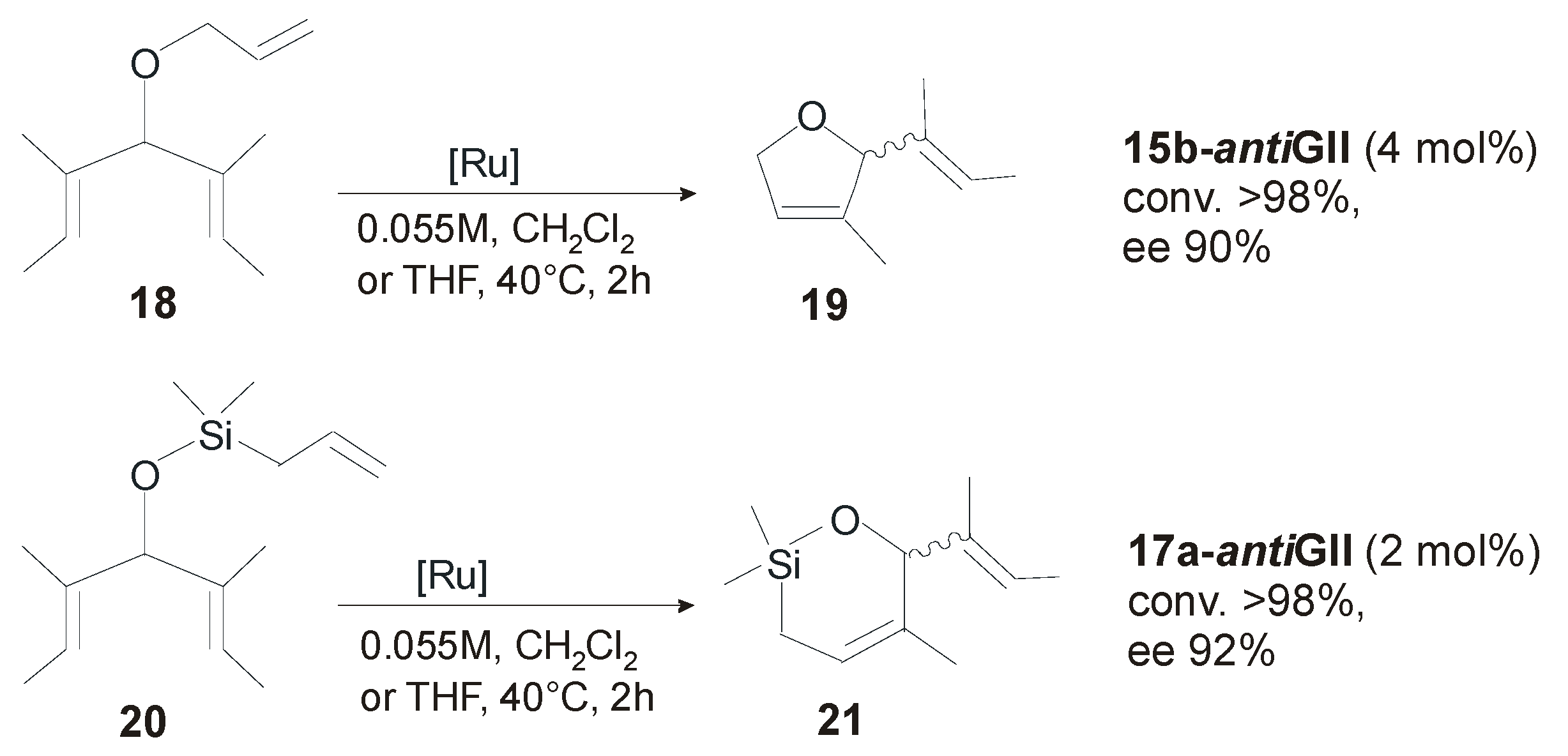 Asymmetric ring closing metathesis of 26 and 28 catalyzed by 21-antiGII.