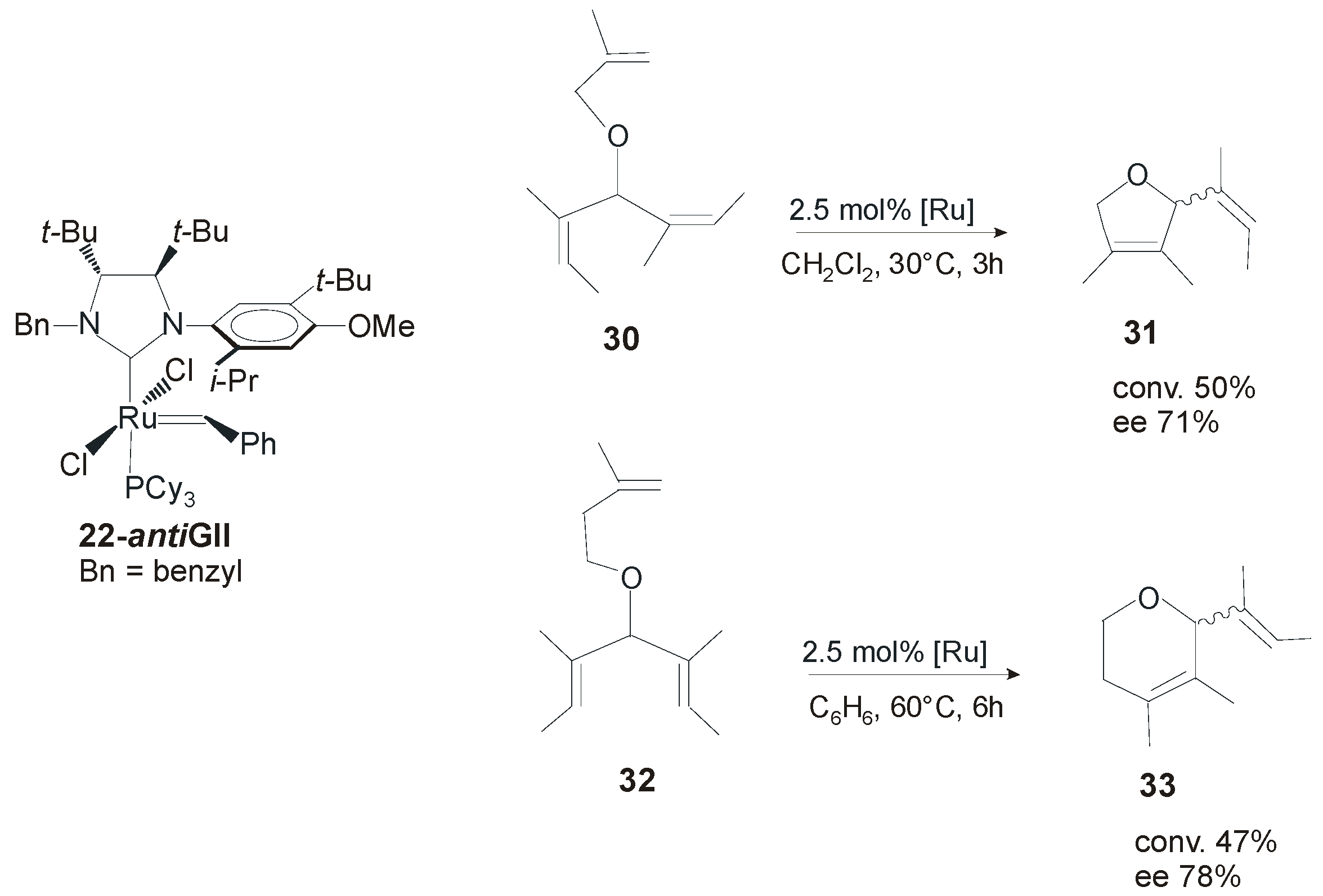 Asymmetric ring closing metathesis of 30 and 32 catalyzed by 22-antiGII.