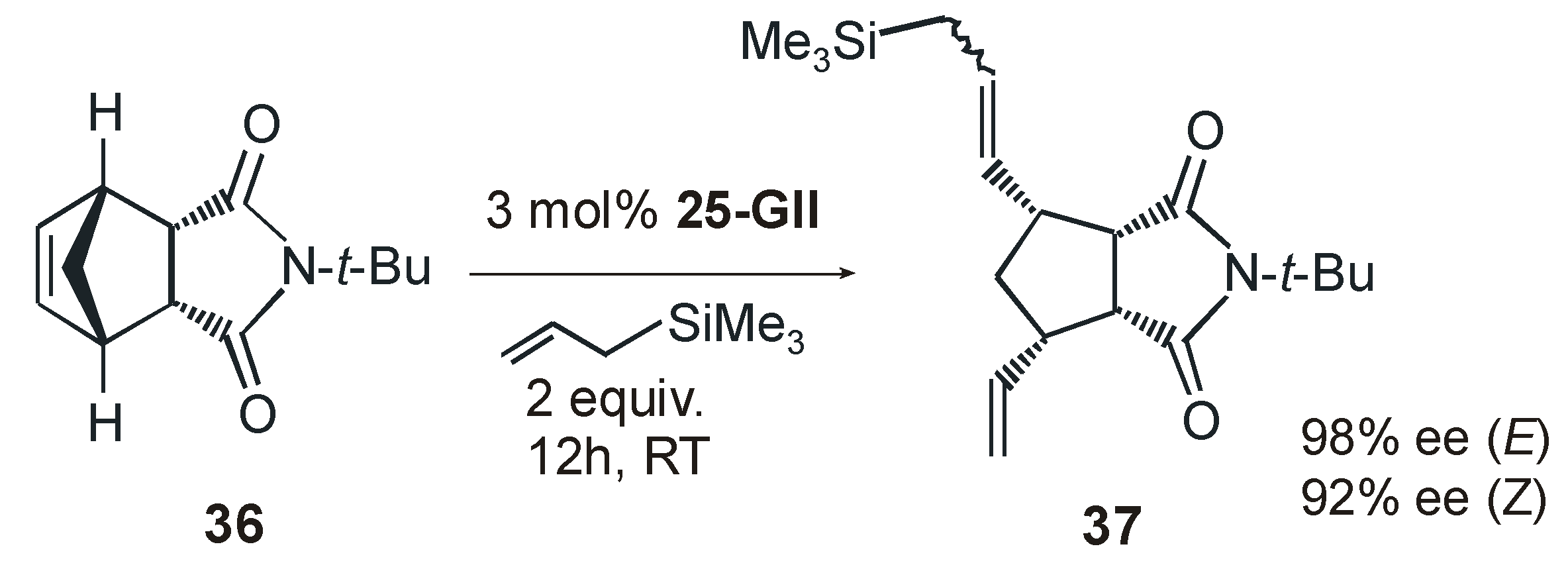 One year later the same group reported ruthenium catalysts 25-GII and 26-HGII coordinated with a new type of chiral NHC ligand presenting an intramolecular linkage between the N-aryl and the backbone which creates a rigid chiral environment around the metal [58]. Catalysts 25-GII and 26-HGII were employed in AROCM with excellent results in terms of activity, enantioselectivity, and substrate scope, however E/Z selectivities were less pronounced than those observed with previous complexes 24-HGII. Significantly, for the first time the AROCM of norbornenes with allyltrimethylsylane as the cross-partner was investigated (e.g., AROCM of 36, Scheme 10). The fixed, non–rotable N-aryl unit in the NHC ligand of catalysts 25-GII and 26-HGII led to higher enantioselectivities for both E/Z stereoisomers of the formed olefin with respect to Grubbs catalyst 18a-antiGII, in which the possible partial N-aryl rotation gives rise to a more flexible reaction pocket, resulting in a lower enantioselectivity [59].