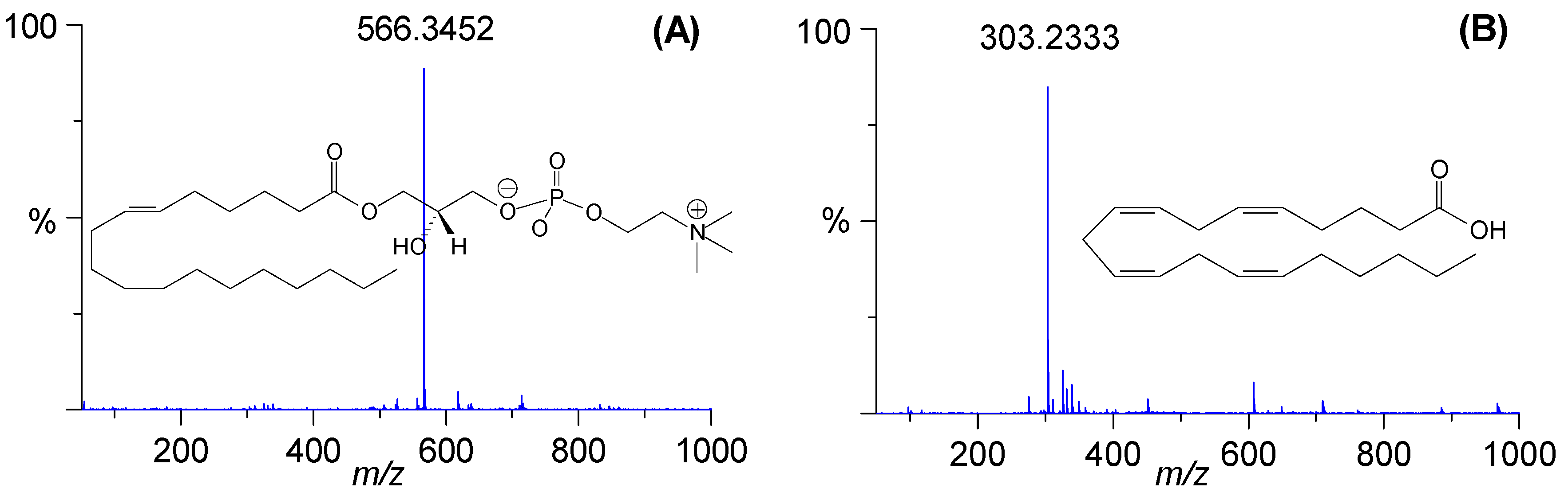 | 2 | 2.41 | 2.58 | [M + HCOO]− | 588.3300 | 0.2 | C28H50NO7P | Lyso-PC C20:4 |