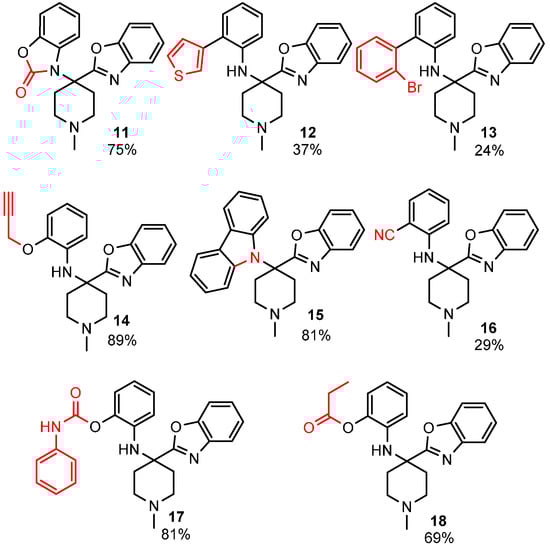 - Varadi, A.; Palmer, T.C.; Notis, P.R.; Redel-Traub, G.N.; Afonin, D.; Subrath, J.J.; Pasternak, G.W.; Hu, C.; Sharma, I.; Majumdar, S. Three-component coupling approach for the synthesis of diverse heterocycles utilizing reactive nitrilium trapping. Org. Lett. 2014, 16, 1668–1671. [Google Scholar] [CrossRef] [PubMed]