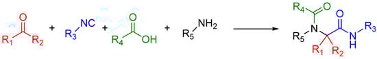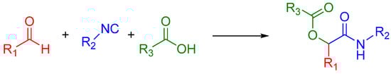 - Dömling, A.; Ugi, I. Multicomponent reactions with isocyanides. Angew. Chem. Int. Ed. 2000, 39, 3168–3210. [Google Scholar] [CrossRef]