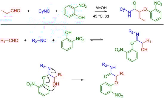 - El Kaim, L.; Gizolme, M.; Grimaud, L. O-Arylative Passerini reactions. Org. Lett. 2006, 8, 5021–5023. [Google Scholar] [CrossRef] [PubMed]